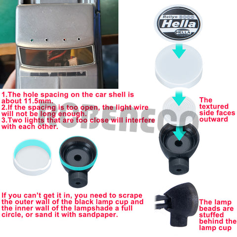 1.The distance between the openings on the car shell is about 11.5mm. If the distance is too open, the light wire will not be long enough. If the distance is too close, the two lights will interfere with each other.
