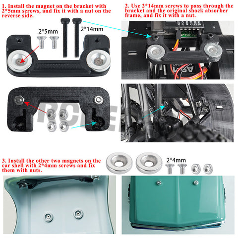 3. Install the other two magnets on the car shell with 2*4mm screws and fix them with nuts.